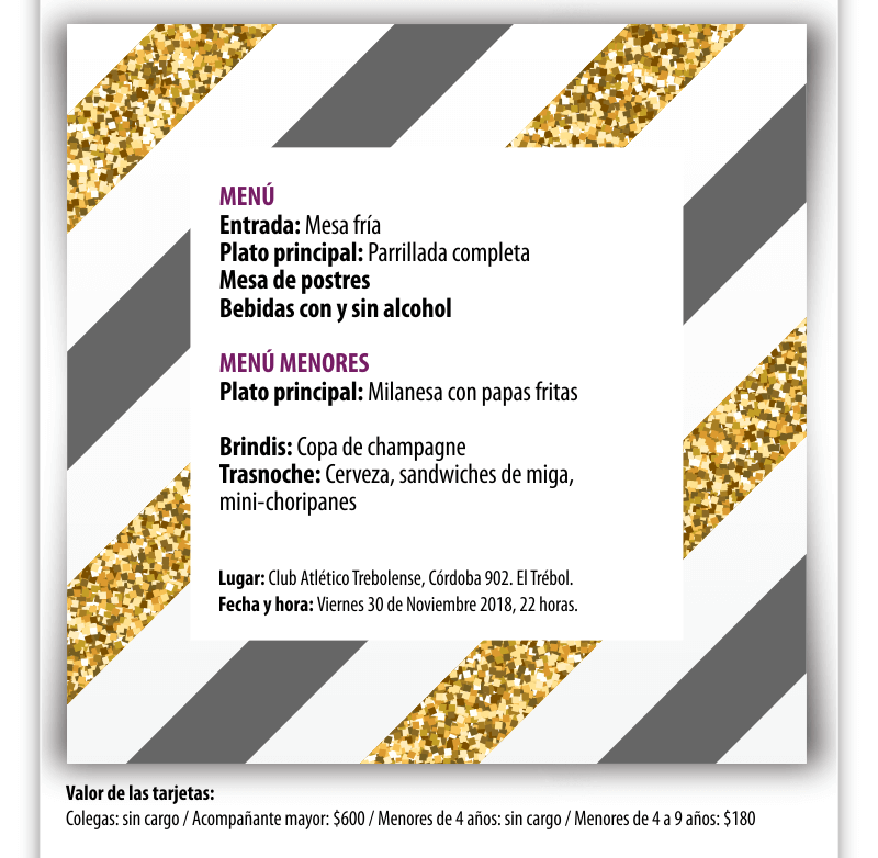 Invitamos a todos nuestros profesionales y sus familias a la Cena de Fin de Año a realizarse el día viernes 30 de Noviembre de 2018 a las 22 horas en el Club Atlético Trebolense, calle Córdoba 902 de la localidad de El Trébol. ¡Los esperamos!